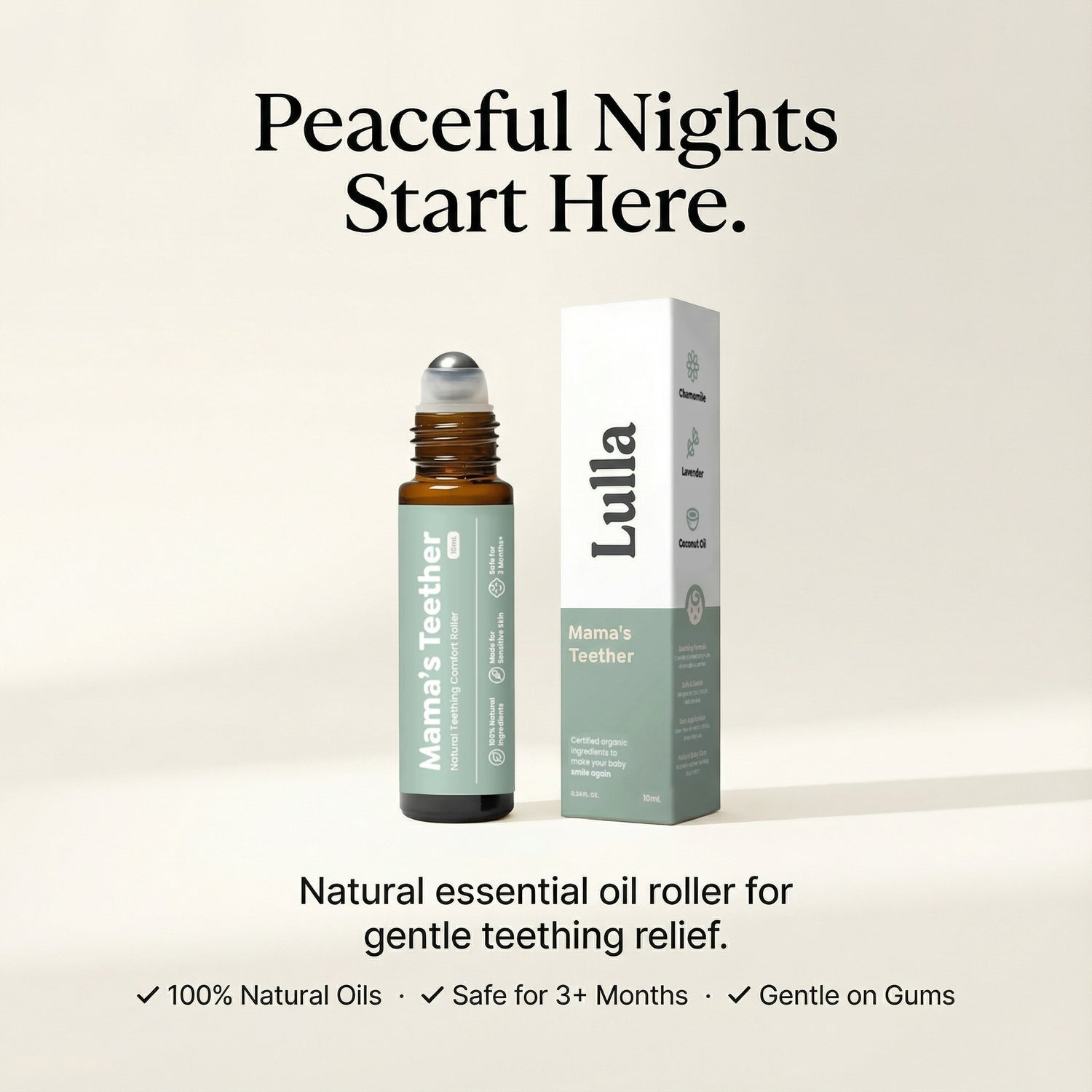Lulla's 100% natural essential oil blend works differently. Chamomile and lavender calm irritated nerves on contact. Coconut and jojoba oil soothe inflamed gums naturally. One gentle roll along baby's jawline delivers relief in minutes — no chemicals, no guilt, no 3am pharmacy runs.